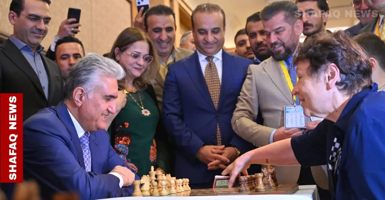 Hon. Rebar Ahmed Khalid (left), Minister of Interior of Kurdistan Region of Iraq, and WGM Strutinkaia, Galina of Russia (right), play a friendly game at the opening of the Asian Seniors Chess Championship.