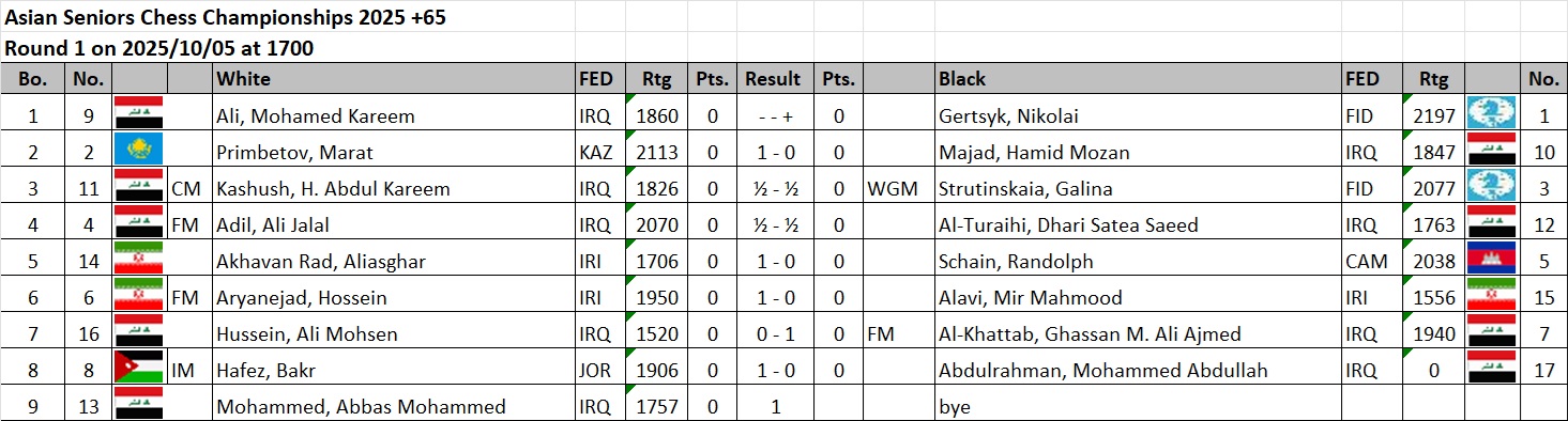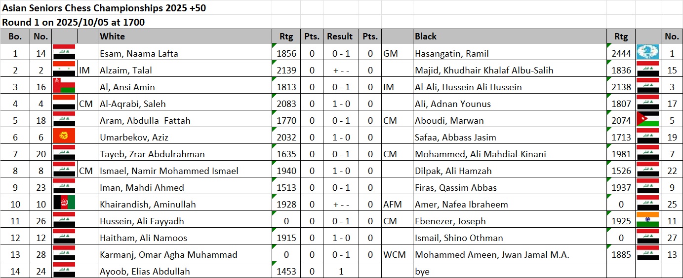 The Asian Seniors Chess Championship opened today with 45 players from 12 countries participating, namely Afghanistan, Cambodia, India, Iran, Jordan, Kazakhstan, Kyrgyzstan, Oman, Russia, Syria, Yemen and host Iraq.