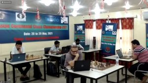The Chinese (above left) are playing in Shanghai and were kind to allow the lone Chinese Taipei player to join them. At right is the Dhaka venue at the Bangladesh Chess Federation headquarters.