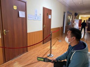 Mongolians were in two adjoining rooms above. Below left, a Mongolian staffer scans players at the entrance. At right are two views of the Singapore playing area at the Singapore Chess Federation headquarters.