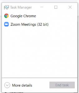 All players are required to share their screen in Zoom with Task Manager “Always in top.” Task Manager (see screenshot below) reveals what programs are running in the computer and the history of applications opened cannot be erased. Players are allowed to open only the Tornelo browser and Zoom.