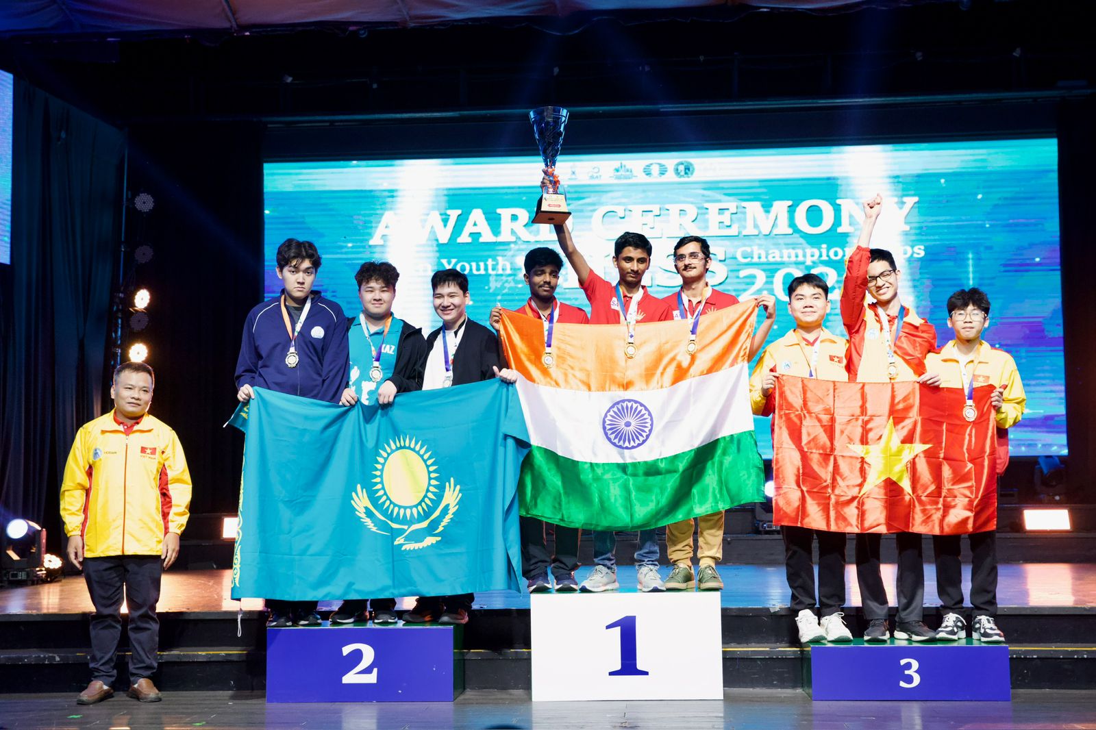 The players under the neutral FIDE flag won best overall with two golds, two silver and two bronze medals followed by China and Vietnam in the Asian Youth Chess Championships held 20-30 November 2025 in Bangkok, Thailand. The record breaking event was organized by the Thailand Chess Association under the auspices of FIDE and the Asian Chess Federation. Awarding overall trophies above are, from left, Chief Arbiter K.K. Chan, ACF Deputy President Bharat Singh and Thailand Chess Association President Sahapol Nakvanich.