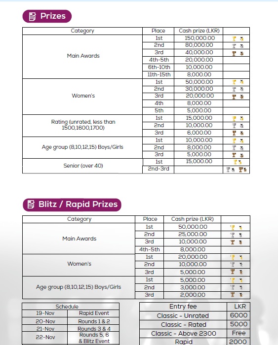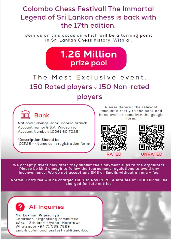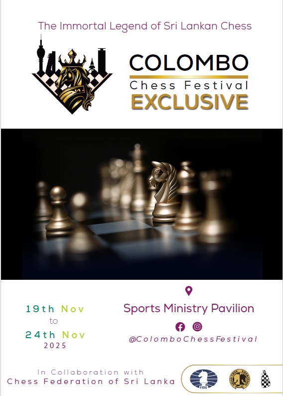 The Sri Lanka Chess Federation shall hold the Colombo Chess Festival from 18th to 24th November 2025 at the Sports Ministry Pavilion in Colombo, Sri Lanka. Download Colombo Chess Festival Prospectus