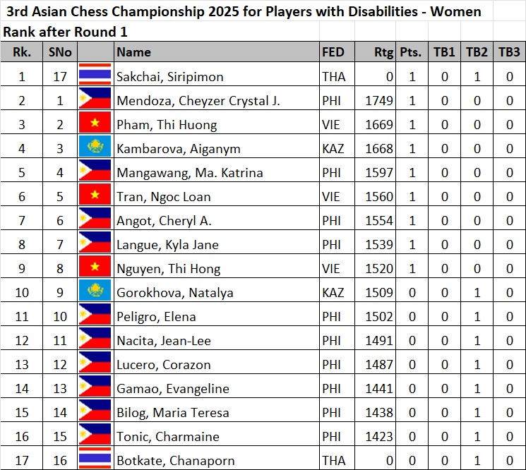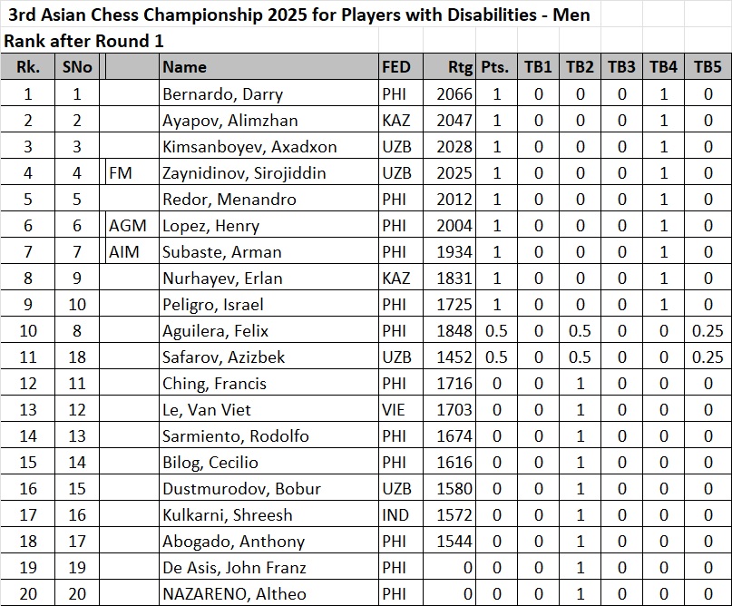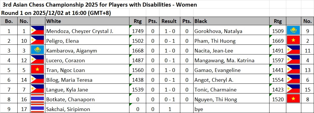 Darry Bernardo, Menandro Redor, Henry Roger Lopez, Arman Subaste and Israel Peligro got off to a blazing start by posting victories in the opening round of the 3rd Asian Chess Championship 2025 for players with disabilities which started 2nd December 2025 in Tagaytay City, Philippines.