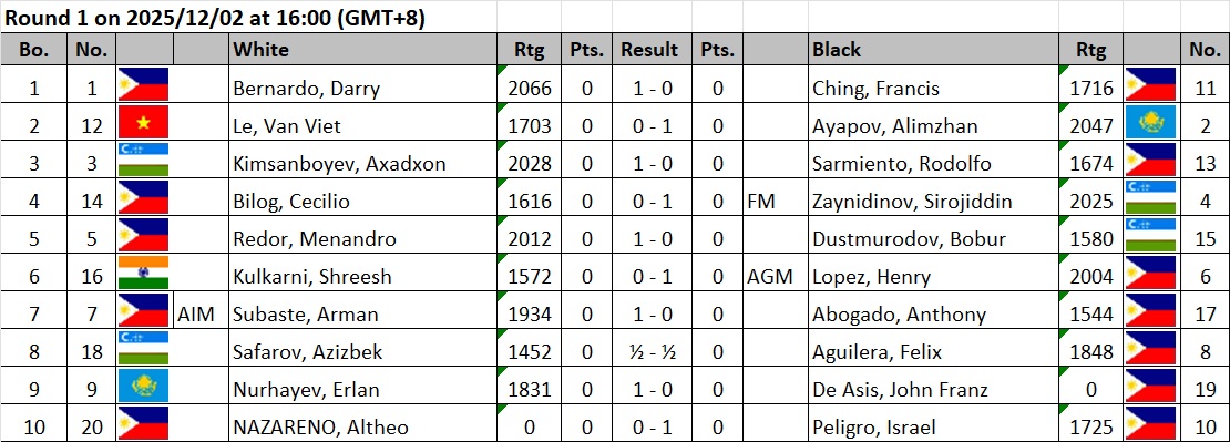 Axadxon Kimsanboyev of Uzbekistan who beat Rodolfo Sarmiento, FM Sirojiddin Zaynidinov of Uzbekistan, winner over Cecilio Bilog while Erlan Nurhayev of Kazakhstan who edged John Franz De Asis.