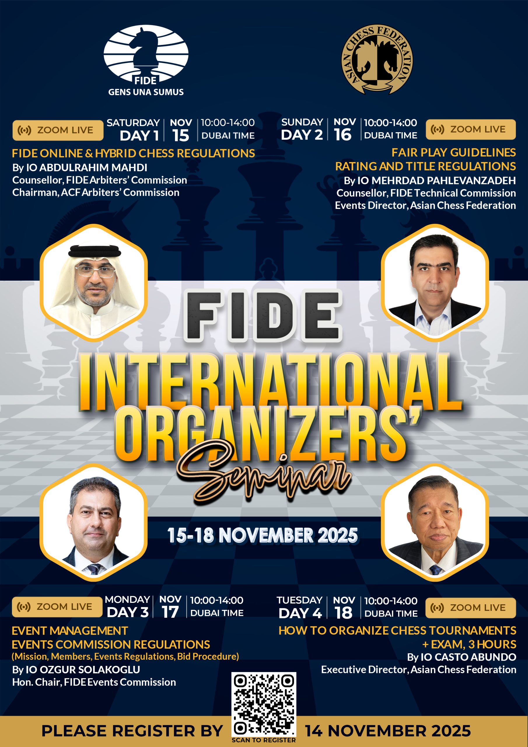 The FIDE International Organizers Seminar starts 15 November 2025 by Zoom. It is intended to educate organizers on how to handle an International Events and the regulations necessary for the event to be FIDE certified. Applicants for the FIDE Associate Organizer and International Organizer titles are required to attend a seminar and pass an examination in order to obtain their FIDE IO title. Certificates of Completion will be awarded to successful participants.