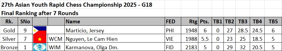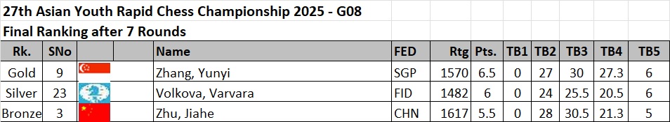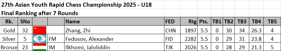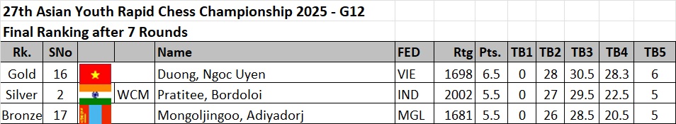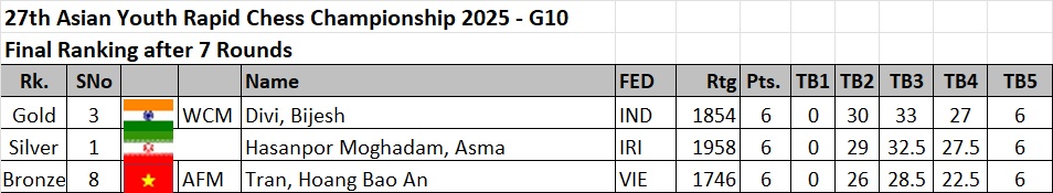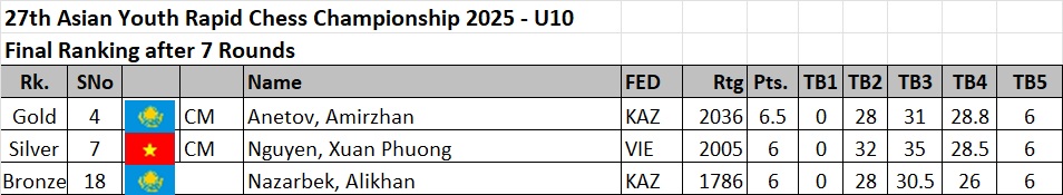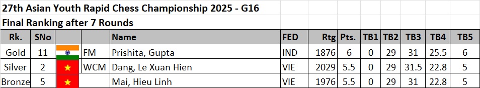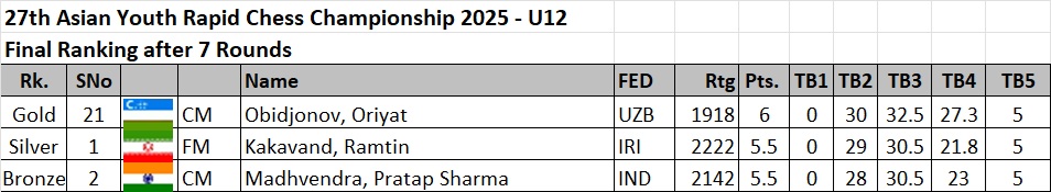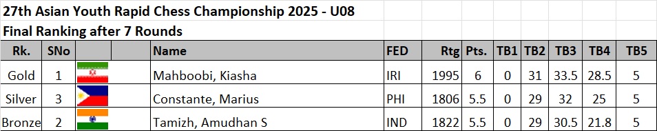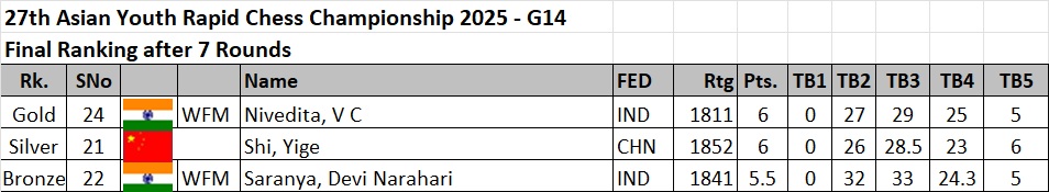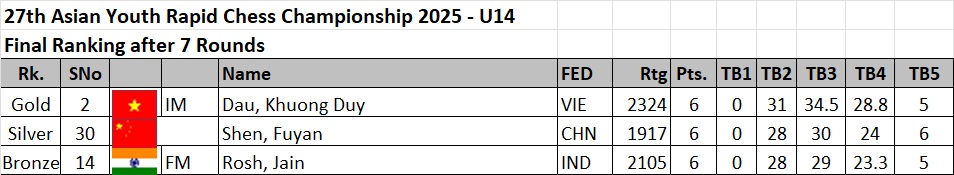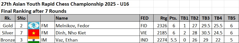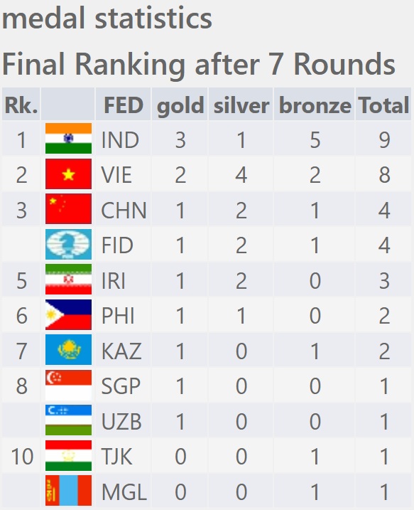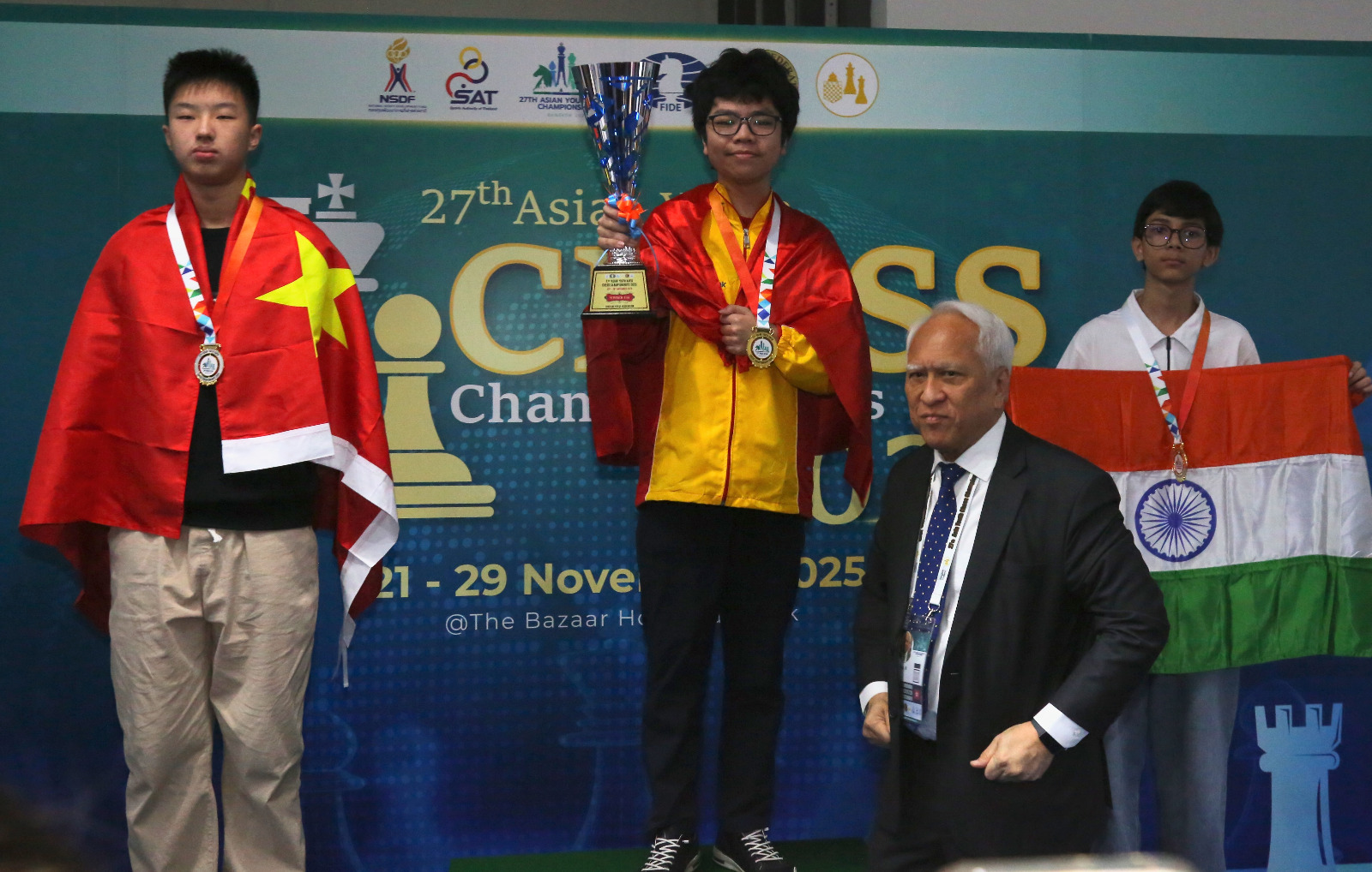 India topped the Asian Youth Rapid Chess Championship with three gold, one silver and five bronze medals followed by Vietnam with two gold, four silver and two bronze medals. China and Russia shared third slot each with one gold, two silver and one bronze medal.