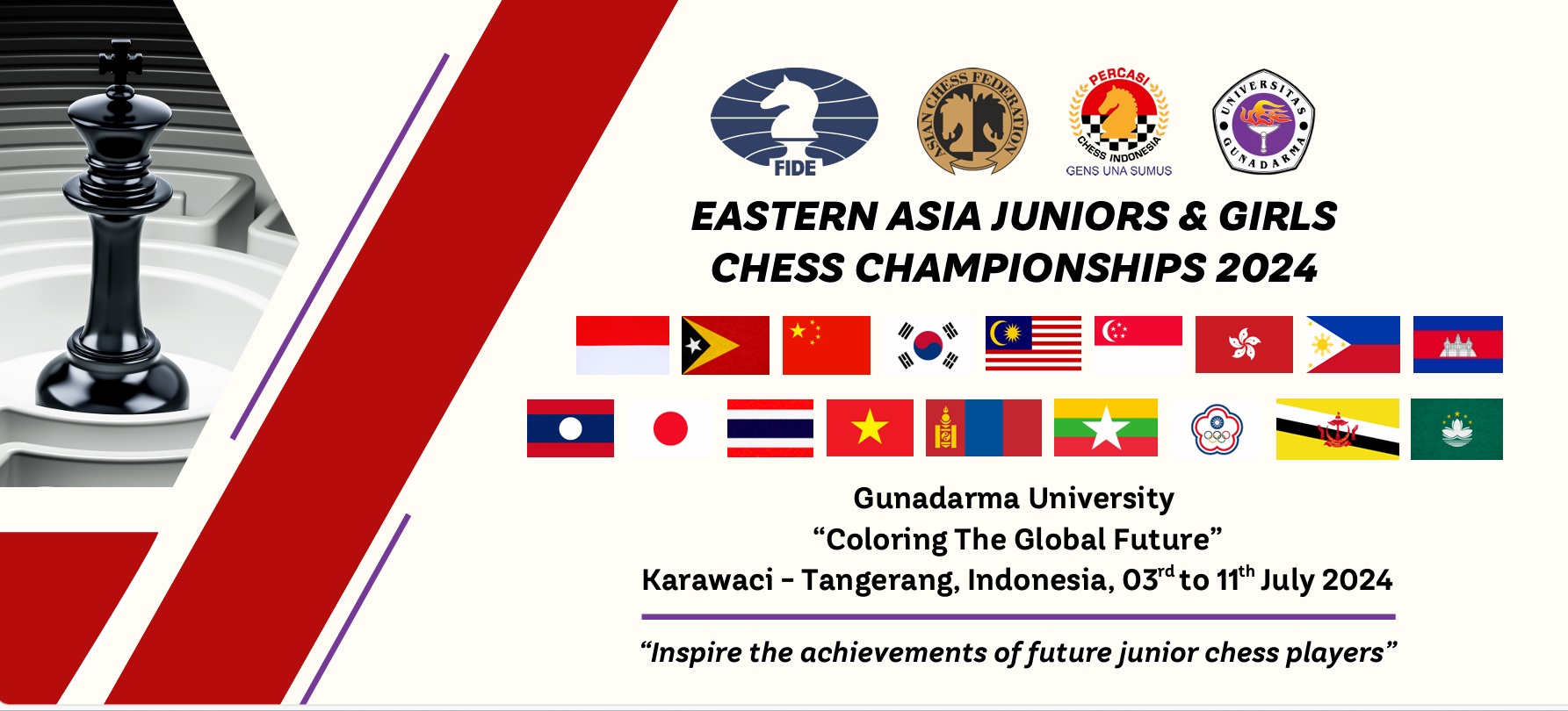 The Indonesian Chess Federation under the auspices of the Asian Chess Federation (ACF) and FIDE, have the honour of inviting participants from National Chess Federations in the region to participate in the Eastern Asia Juniors and Girls Chess Championships 2024 scheduled from the 3rd of July to the 11th of July 2024 at the Ballroom of Gunadarma University, Karawaci-Tangerang, Indonesia.