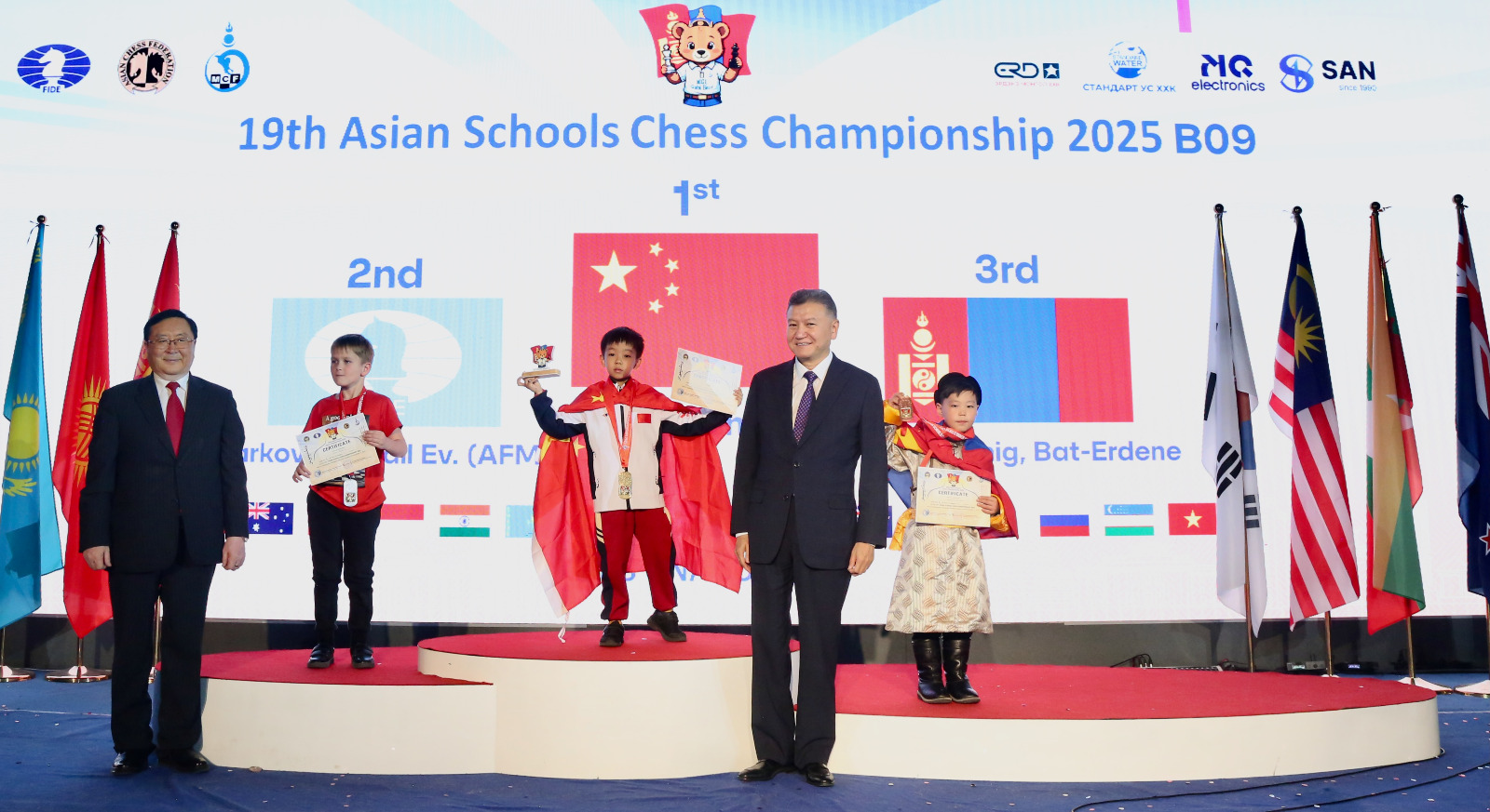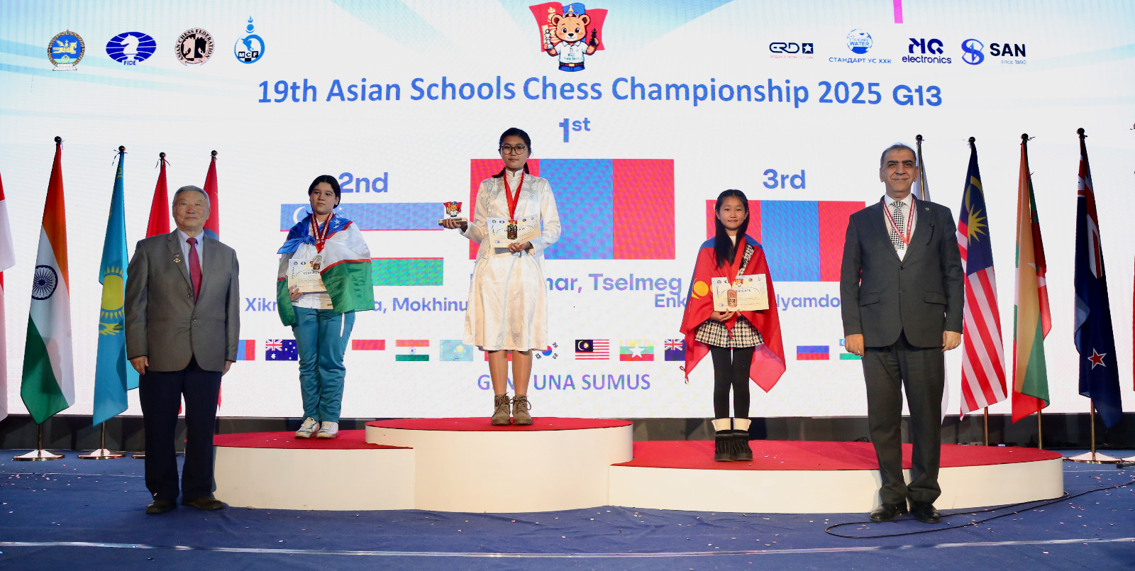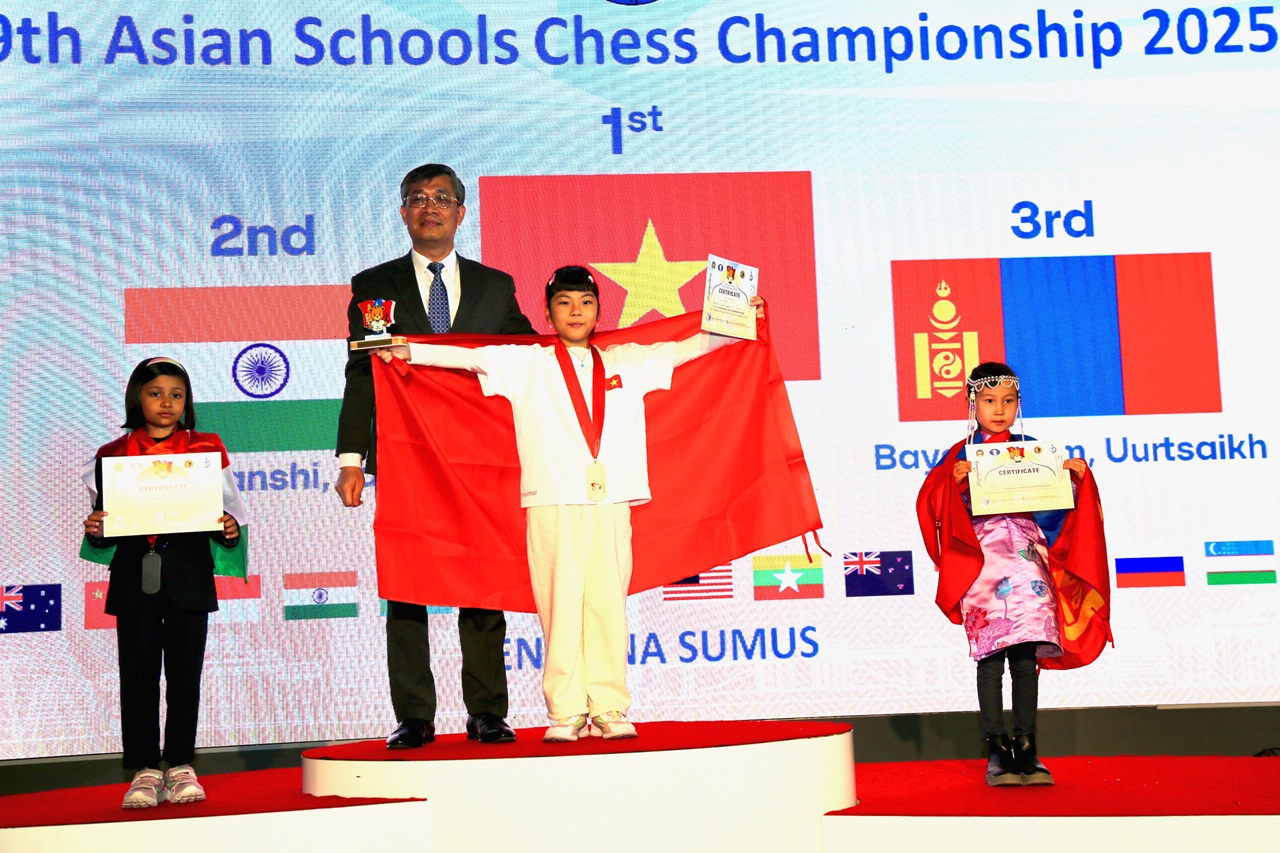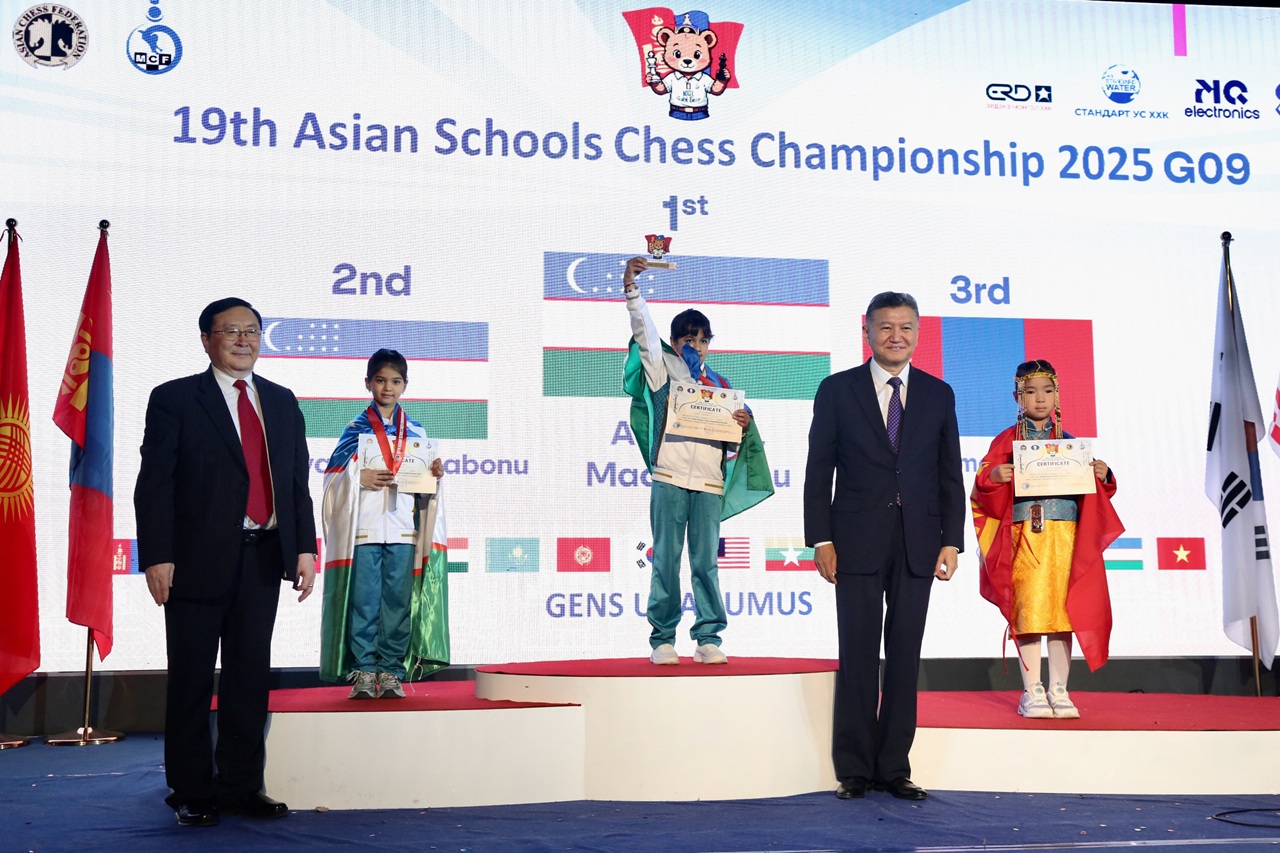 Mongolian children won three gold, three silver and eight bronze medals to top the Asian Schools Chess Championship standard event held 24th to 31st October in Ulaanbaatar, Mongolia.
