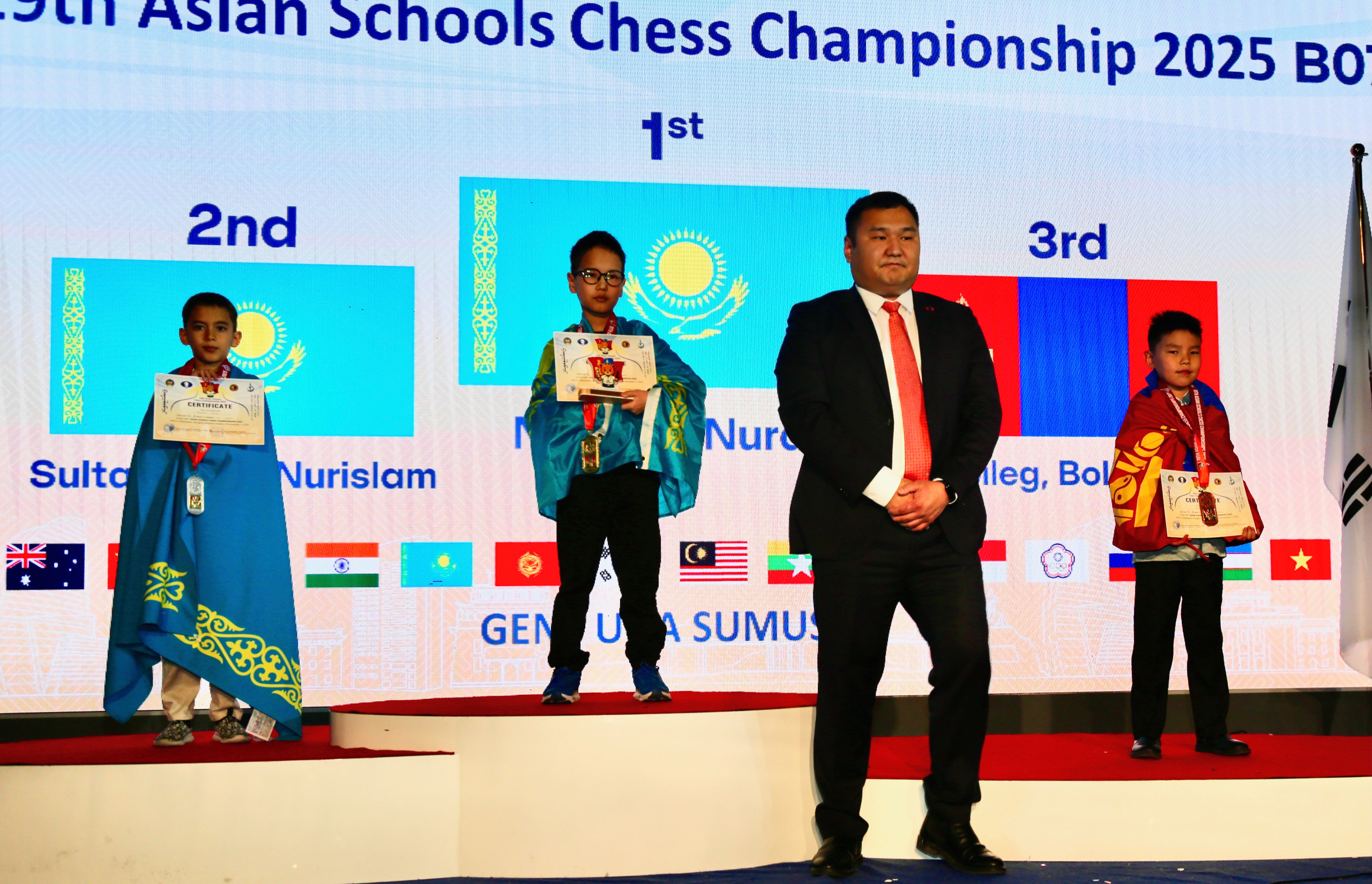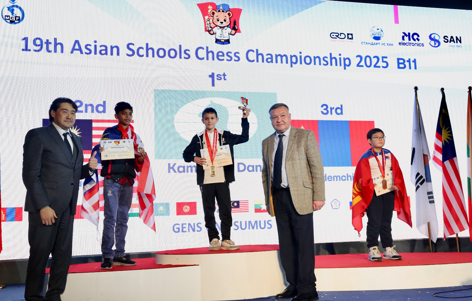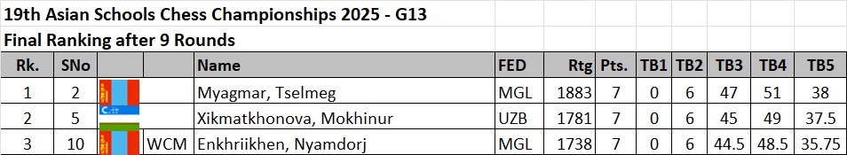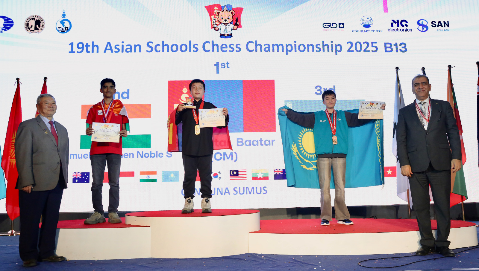 Mongolian children won three gold, three silver and eight bronze medals to top the Asian Schools Chess Championship standard event held 24th to 31st October in Ulaanbaatar, Mongolia.