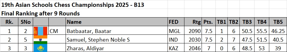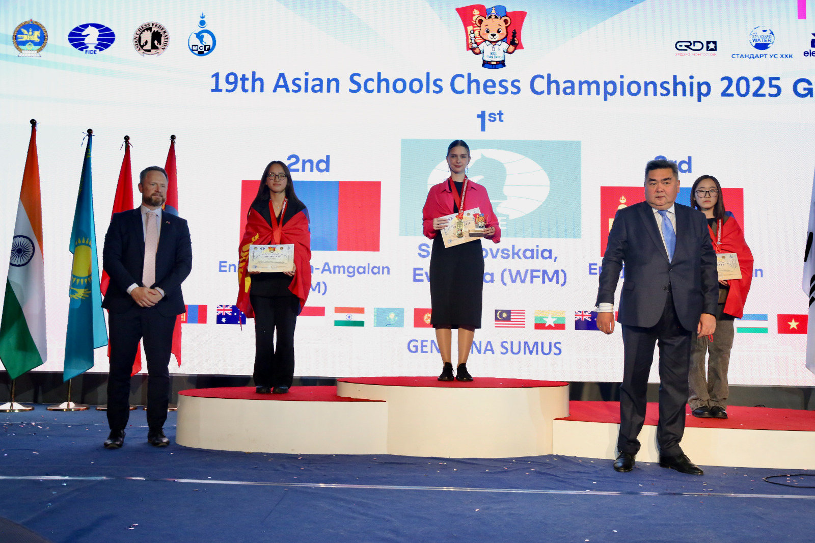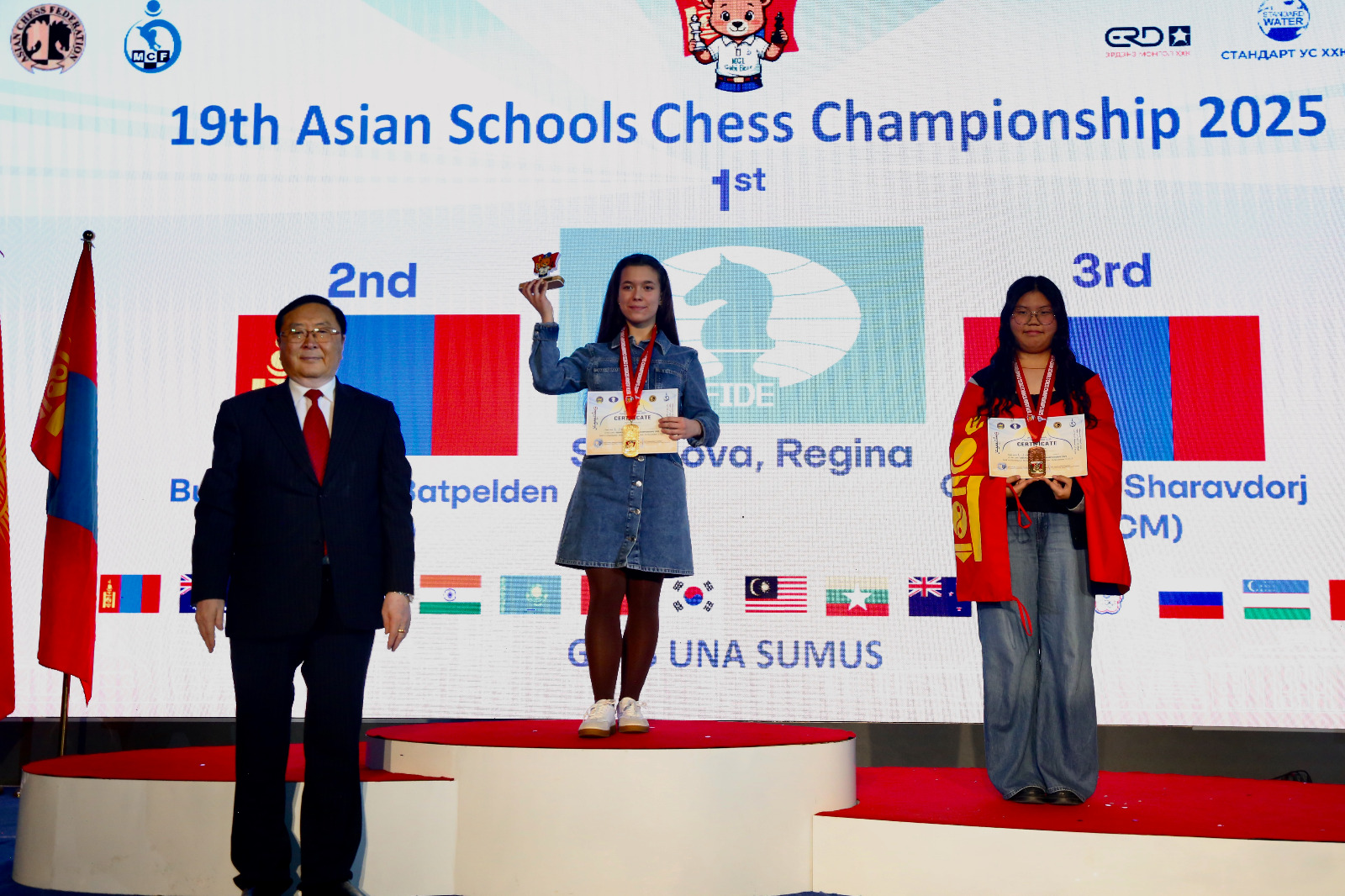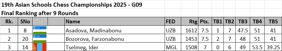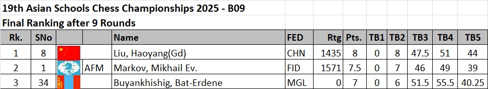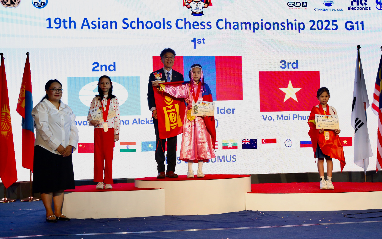 Mongolian children won three gold, three silver and eight bronze medals to top the Asian Schools Chess Championship standard event held 24th to 31st October in Ulaanbaatar, Mongolia.