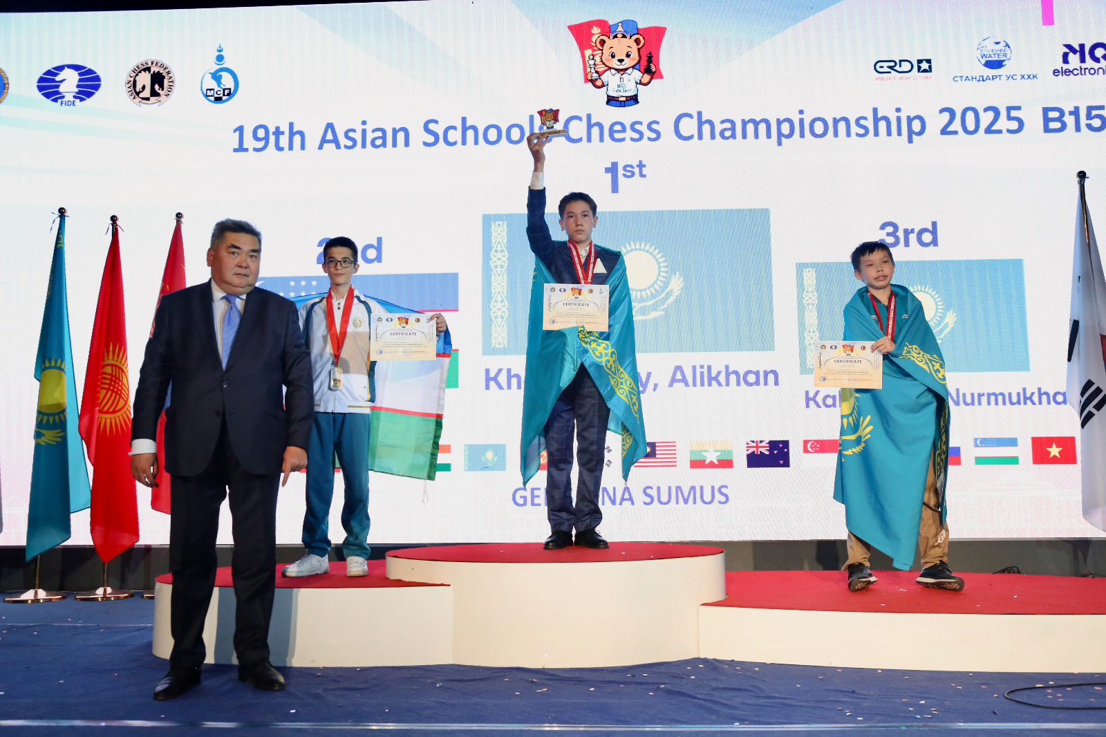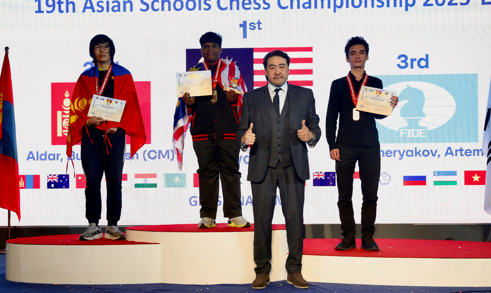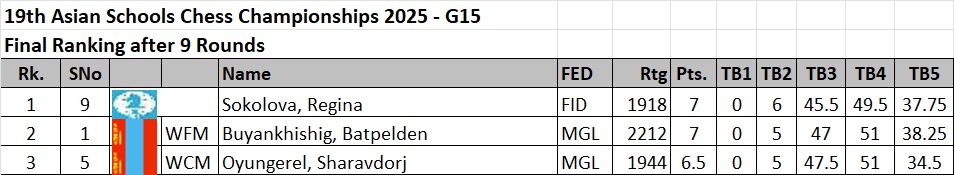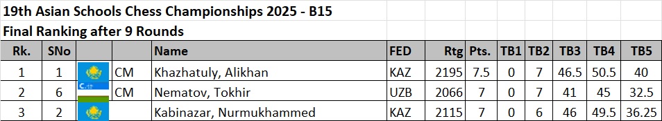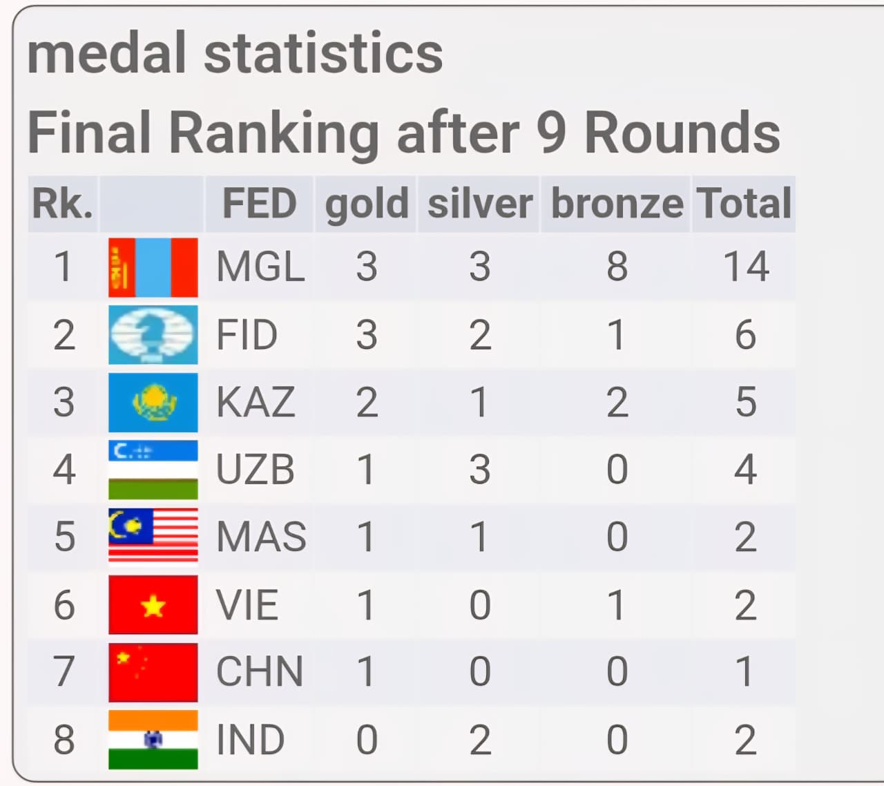 Russians playing under FIDE flag followed with three gold and two silver medals. Kazakhstan placed overall third with two gold medals.