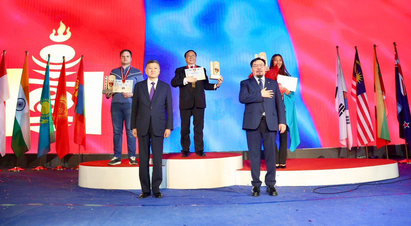 Prime Minister Gombojav Zandanshatar (right), president of the Mongolian Chess Federation, and former FIDE President Kirsan Ilyumzhinov award trophies to the top three federations.