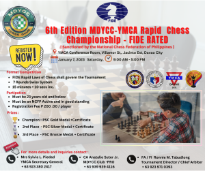 The 6th Metro Davao Youth Chess Club-YMCA FIDE Rated Rapid Chess Championship is scheduled Saturday, 7th January 2023 at the YMCA in Davao City. The tournament is sanctioned by the National Chess Federation of the Philippines. time control is 15 minutes plus 10 second increment in 7 rounds Swiss System.