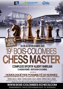 Filipino Keiffer Pelias of Cabuyao City clinched the year-ending 19th Bois-Colombes Chess Master Open B Tournament held December 26–30, 2022, in Paris, France.