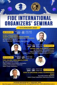 Asian Chess Federation will organize an online International Organizers Seminar 5-8 January 2023 by Zoom to educate organizers how to handle an International Event and the regulations necessary for the event to be FIDE certified. Applicants for the FIDE International Organizer title are required to attend a seminar and pass an examination in order to obtain their FIDE IO title. Certificates of Completion will be awarded to successful participants.