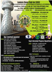 The Isabela Chess Club of the Philippines, Inc. 1st FIDE Rated Chess Tournament is scheduled 7-9 January 2023 at the Alicia Community Center in Alicia, Isabela. A total of P37,000 in cash prizes are at stake in the 7-round Swiss. Standard time control of 90 minutes plus 30 second increment for each player starting from move 1 shall apply.