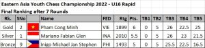 “I’m very happy to win again, especially in an international tournament like this Asian Seniors with One Grandmaster norm and an outright International Master title. Bagamasbad pocketed the top prize of $350 plus qualification to the 2023 World Seniors Chess Championships.