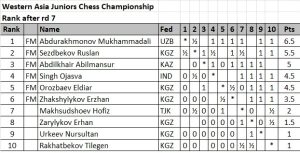 In the girls division, Sultanbek Zeinep of Kazakhstan and Malikova Marjona of Uzbekistan are tied for the lead with 5.5 points each after 7 rounds.