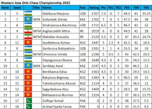 Mukhammadali Abdurakhmonov (center, left) and Marjona Malikova (center, right), both of Uzbekistan, won the Western Asia Juniors and Girls, respectively, in the championship organized by the Kyrgyzstan Chess Federation on behalf of the Asian Chess Federation and FIDE, 5-15 September 2022 at the leisure resort of Korumdu, Issyk-Kul, Kyrgyzstan. Visit chess-results.com. Watch broadcast of games on lichess, and blitz.