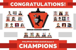 Manila—The Mindanao team Surigao Diamond Knights demolished Edmonton Oilers Uniteam in their best of three final match 2-0 to win the championship trophy of the highly competitive professional team chess competition Mayor Sara Duterte-Carpio Cup Philippine Chess League Season 3 virtually held at Lichess Platform.