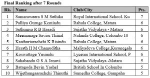 Saviru Thinal Meemanage (Nalanda College) and Rasindu Manketh Kasthuriarachchi (Rahula College Matara) also scored 6 points and had to satisfy with the 4th and 5th places due to the poor tie breaking points.