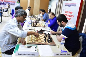 Saif Sporting Club drew with Leonine Chess Club by 2-2 game points. Md. Abzid Rahman and IM Aronyak Ghosh of Leonine Chess Club won against GM Niaz Murshed and GM Reefat Bin Sattar of SAIF Sporting Club respectively. Iranian GM Idani Pouya and Georgian GM Mikheil Mchedlisvili of Saif Sporting Club won against IM Srijit Paul and WFM Tanima Parveen respectively.