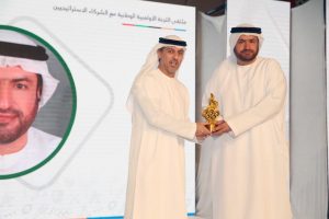 Minister Dr. Ahmed Belhoul Al Falasi (left) presents the award to Hisham Al Taher.
