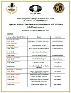 The Women’s Championship will be held on 29th, 30th and 31st of October starting 5.00 p.m. each day with three rounds a day. A total of 9 rounds will be played if the number of players are less than 100.