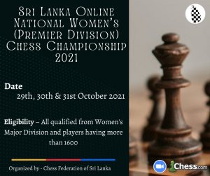 The Chess Federation of Sri Lanka is organizing a comprehensive Online Rapid Chess Championship Cycle for the first time in Sri Lanka This event will be the selection event for the International Online Rapid Chess Championships this year and the event will help all Chess players to stay at home at this difficult time with supporting to grow their Chess Strength. The event will be held on the Chess.com platform with all the fair play regulations approved by FIDE. The Time Control is 15 minutes + 10 second increment for each move played.