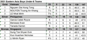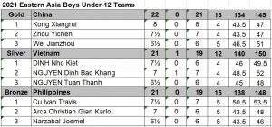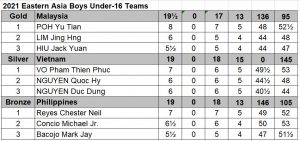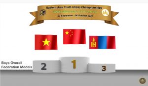 China won 3 gold medals followed by Vietnam with 2 golds and Malaysia with one gold to rule the Eastern Asia Youth Chess Championship last weekend from 1-3 October 2021 on Tornelo. Download games from chess-results.com and see round by round results and standings. Watch the closing ceremony held 6th October on .see https://youtu.be/FVc83cxlsoo