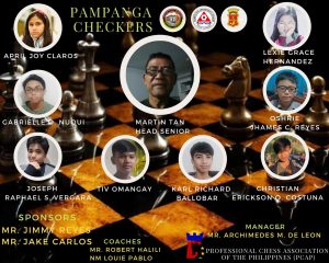 Backed up by Mr. Jaime “Jimmy” Reyes and Mr. Jake “Talov” Carlos, the Pampanga Checkers squad also tapped the services of Mr. Martin Tan (Head Senior), Mr. Robert Halili (Coach), NM Louie Pablo (Coach) and Mr. Archimedes Miranda de Leon (Team Manager).