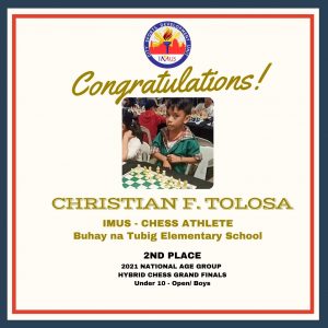 MANILA, Philippines—Christian F. Tolosa brought honor to Imus City, Cavite with his runner-up finish in the boys 10 and under division of the 2021 Hybrid National Age Group Chess Championship Grandfinals last June 26-29, 2021 held at Tornelo platform.