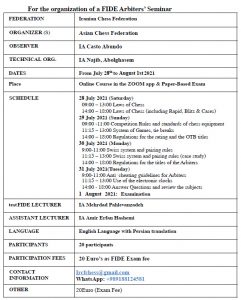 The Chess Federation of the Islamic Republic of Iran on behalf of FIDE and the Asian Chess Federation will conduct a FIDE Arbiters’ Seminar 28th July to 1st August 2021 via Zoom. Visit FIDE.com announcement