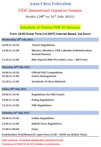 A FIDE International Organizer Seminar in Arabic shall be conducted by IA/IO Abdulrahim Mahdi, FIDE Rules Commission Chairman and Asian Chess Federation Arbiters Commission Chairman from 28-31 July 2021. Email mahdi.abdulrahim2020@gmail.com for details.