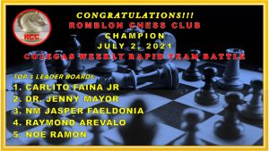 MANILA, Philippines— Carlito Faina Jr., Municipal Local Government Operation Officer of Alcantara, Romblon scored 63 points to lead Romblon Chess Club to victory in the Weekly Rapid Tournament organized by Colegas Chess Team of Madrid, Spain last July 2, 2021, 4:00 PM to 9:00 PM which was held at lichess. com.