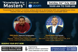 On the path to producing world level players, the Chess Federation of Sri Lanka has acknowledged the need for polished chess trainers in the country. And hence the National Chess Trainers Commission has developed many programs and strategies to standardize the skills of chess trainers in Sri Lanka. “Knowledge for masters” is another unique attempt at developing skills and equipping our coaches with the required knowledge, with the long-term goal of producing sustainable talent. The event will kickstart on the 4th of July 2021 at 9.00 AM via Zoom.