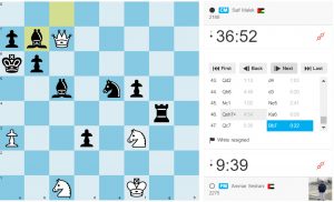 Koniahli essayed a Queen’s Pawn Game. Idani gave up a Rook for Knight exchange on the 11th move to advance his b-pawn. The Syrian countered by penetrating with his Rook on the seventh rank. Idani resigned on the 31st move facing loss of material to save his beleaguered Queen (see diagram below).