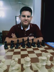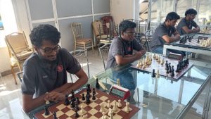 The Blue and Gold who were in the 1st equal in match points yesterday lost to the Sokians CC 3 ½ – 2 ½ in the morning, the 3rd round. They strongly came back in the 4th round scoring a 3 ½ – 2 ½ win against the Maroons Chess Club. Sasith Piyumantha and Kasun Wimalasuriya scored full points to Sokian’s from S Anojman & Isara Banindu Dahanayake while Minul Doluweera (photo above) beat Gihan de Silva for Blue and gold CC. The other three games were drawn.