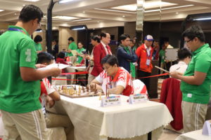 Under this format at this Games, each player has 15 minutes, with 10 seconds added after every move, starting from the first. Games typically last for about 40 minutes, with a point for a win and half for a tie.