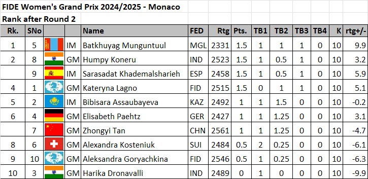 1-4. Humpy Koneru, Kateryna Lagno, Sarasadat Khademalsharieh and Batkhuyag Munguntuul – 1.5; 5-7. Bibisara Assaubayeva, Elisabeth Paehtz and Tan Zhongyi – 1; 8-9. Alexandra Kosteniuk and Aleksandra Goryachkina – 0.5; 10. Harika Dronavalli – 0.