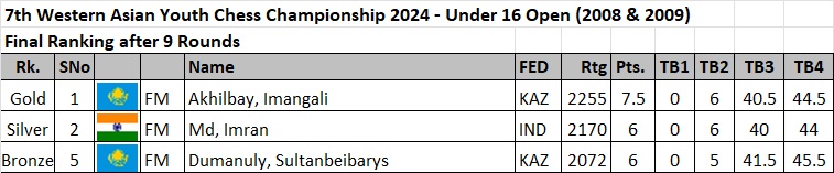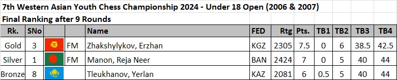 Sehba Shah of Pakistan receives the champion’s trophy in the Mian Sultan Khan 8th Women National Chess Championship held 29 June to 5 July 2024 in Islamabad, Pakistan. Standing at center is Chess Federation of Pakistan president Hanif Qureshi. Seeded 23rd, Sehba Shah finished with 6.5 points in the 7 round Swiss System. Visit chess-results.com for round by round results and standings.