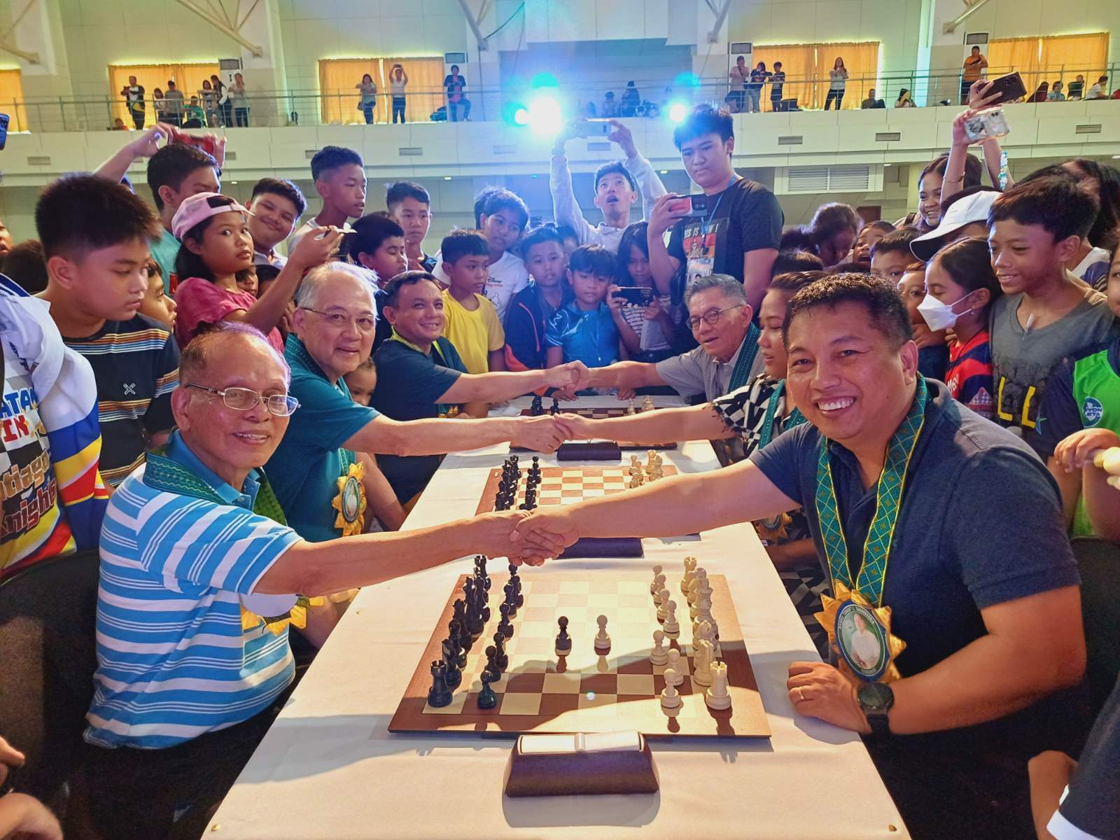 Making the ceremonial opening moves are from foreground, left vs right, Judge Rossendo Bandal vs FST/GM Jayson O. Gonzales , Engr. Gregorio Uy Matio vs WGM Janelle Mae Frayna, Atty. Ryan Buenavista vs GM Eugene Torre.