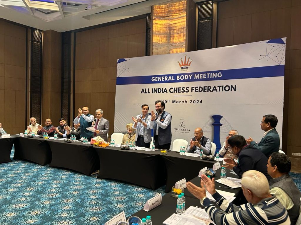 New Delhi (12 Mar 2024) :- Following the National Sports Code, the AICF General Body unanimously elected the new set of office bearers for the term 2024-27 headed by Shri Nitin Narang of Haryana as President and Shri Dev A Patel of Gujarat as Secretary. International Arbiter Shri Dharmendra Kumar of Bihar is the new Treasurer for the Federation.