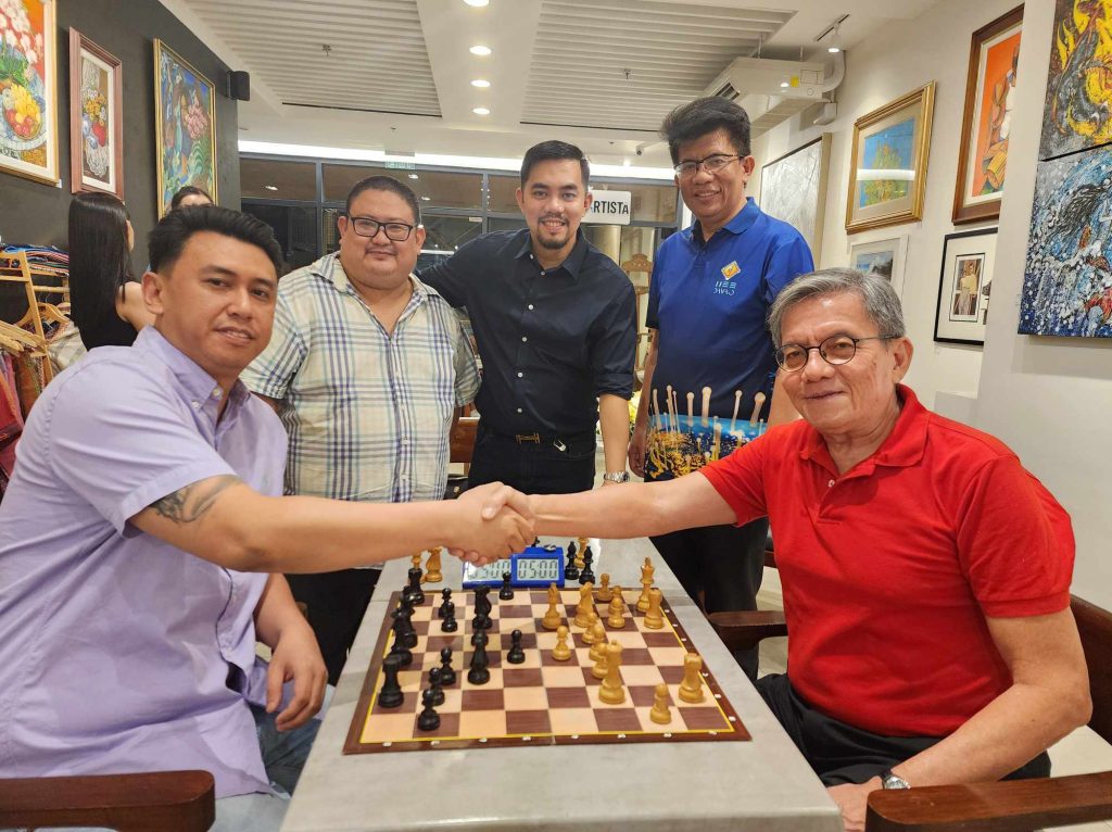 Shimmer & Shield Car Coating President/CEO Jeff Bugayong (left) shakes hands with Asia’s First Grandmaster and Hall of Fame Eugene Torre to signal the start of the month-long series. Looking on are, from left, NM/US master Almario Marlon Bernardino Jr., RDR Business Solution Inc. President/ CEO/Pambansang Business Mentor Reymond Delos Reyes and Institute of Integrated Electrical Engineers of the Philippines (IIEE) National Past President Engr. Allan Anthony Alvarez.