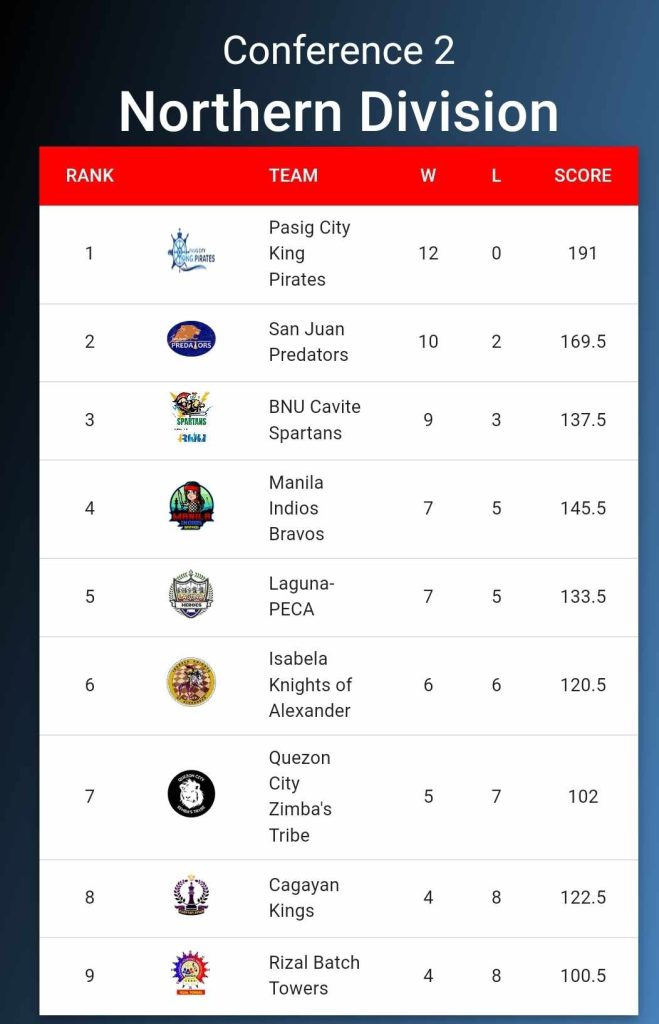Pasig City King Pirates remain on top with a 12-0 slate followed by the San Juan Predators who hold a 10-2 win-loss record.