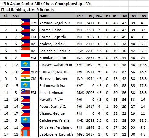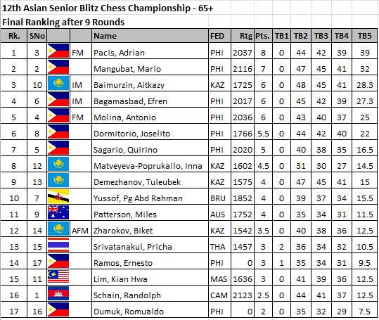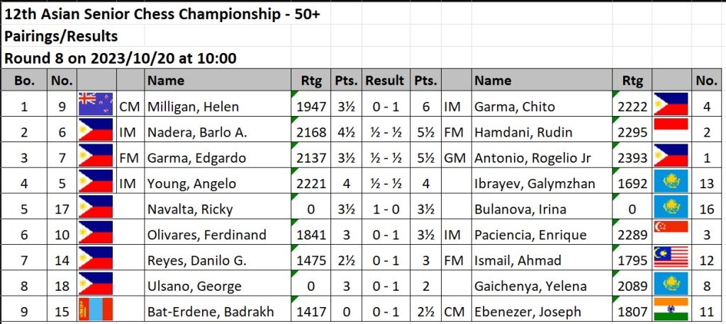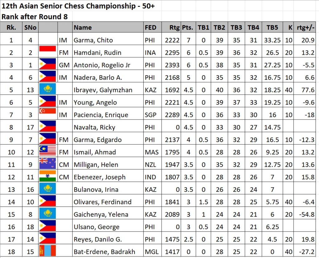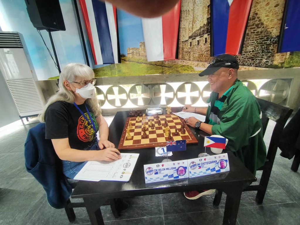 Over in the 50-above category,  former Asian Seniors champion International Master Chito Garma (above right) defeated Candidate Master Helen Milligan of New Zealand to retain his top post after eight rounds.