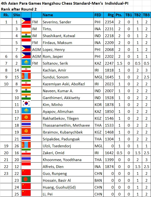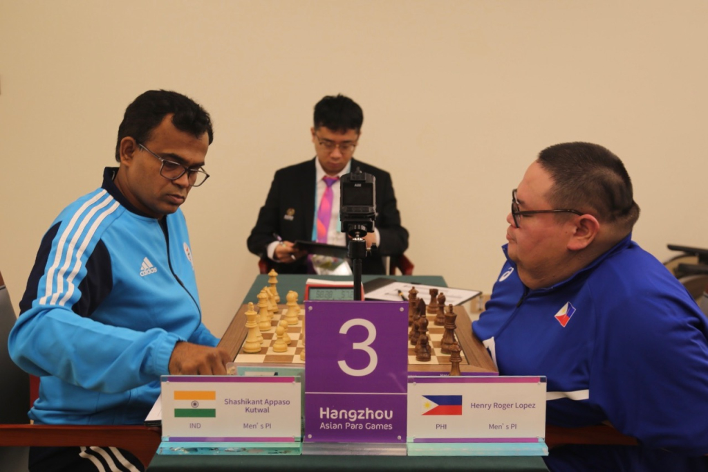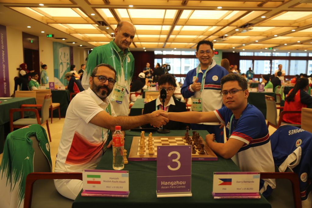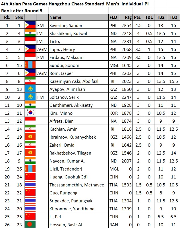FM Sander Severino leads the Men’s Individual P1 category with 4.5 points after five rounds of the Asian Para Games Chess Competition in Hangzhou, China. Alireza Ghoorchibeygi of Iran and Yoga Indra of India are tied for the Men B1 category lead with 4.5 points each. Menandro Redor of the Philippines and Gangolli Kishan of India share the lead in the Men B2&B3 category with 4 points each.
