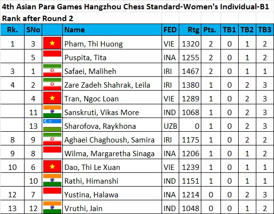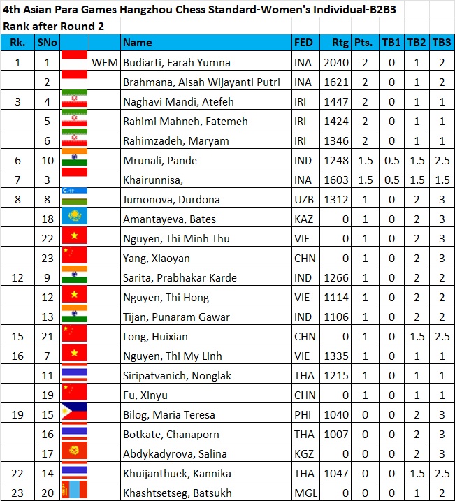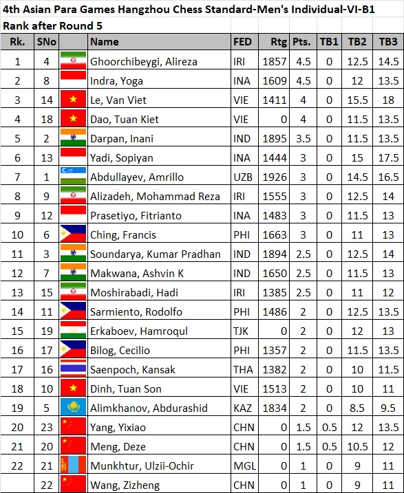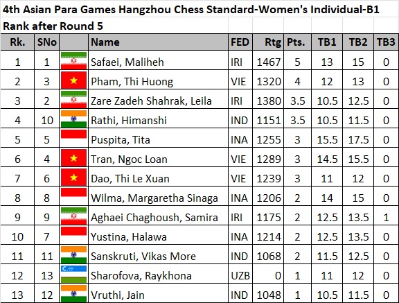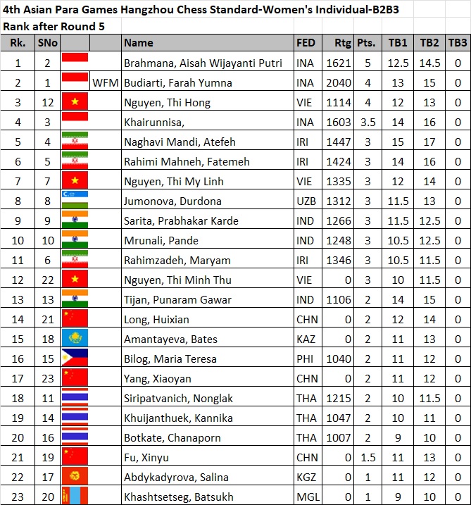 In the women’s division, Cheyzer Crystal Mendoza of the Philippines leads with 4.5 points after 5 rounds, a full point ahead of second runners with 3.5 points each. Maliheh Safaei of Iran leads the Women B1 category with a perfect 5-point slate. Similarly Brahmana, Aisah Wijayanti Putri of Indonesia leads the Women B2&B3 category with a perfect 5 points.