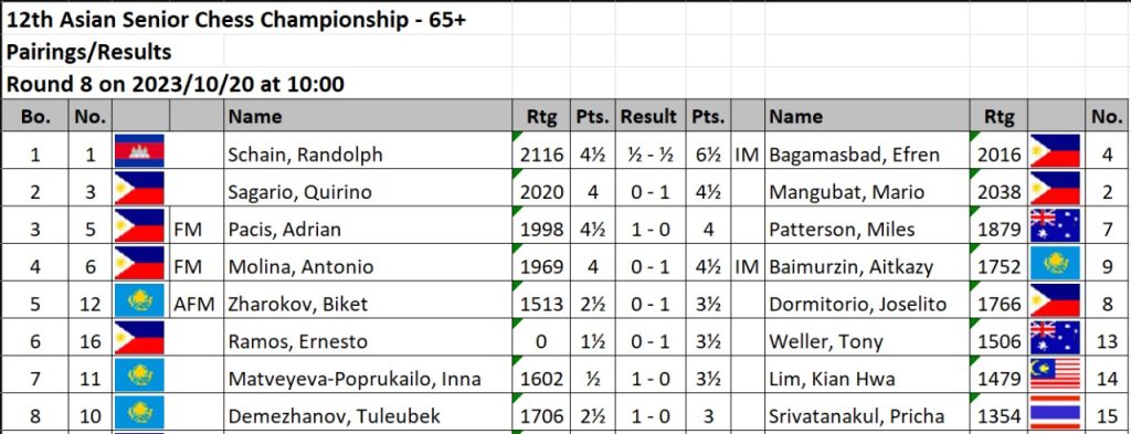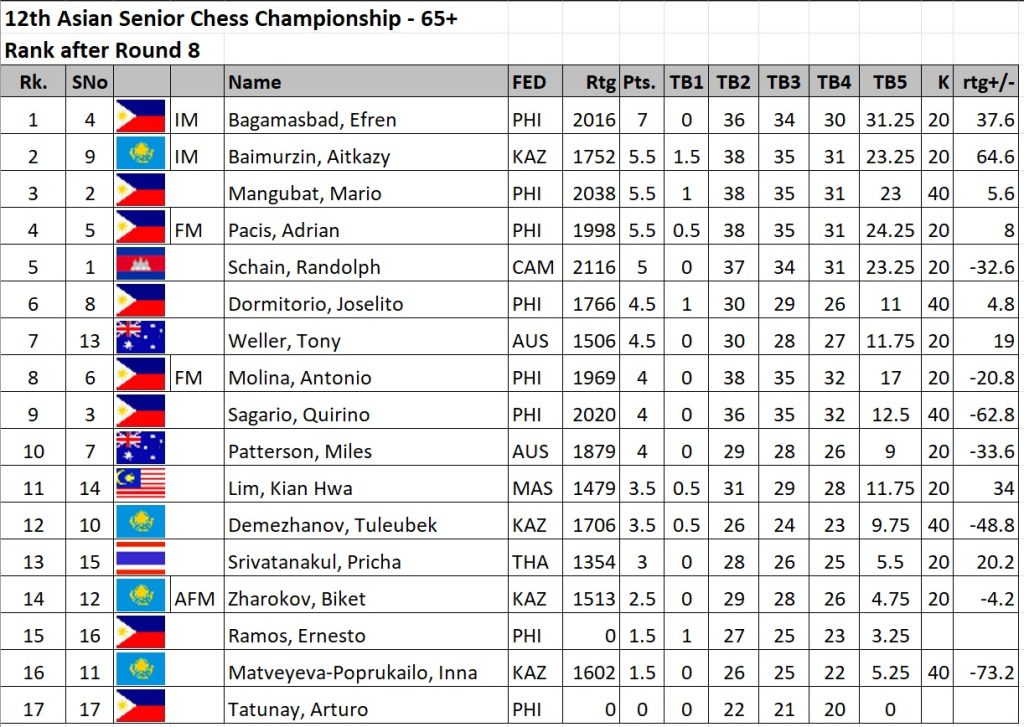 International Master Aitkazy Baimurzin of  Kazakhstan, FIDE Master Adrian Ros Pacis and National Master Mario Mangubat of the Philippines are tied for 2nd place with 5.5 points each after eight rounds.